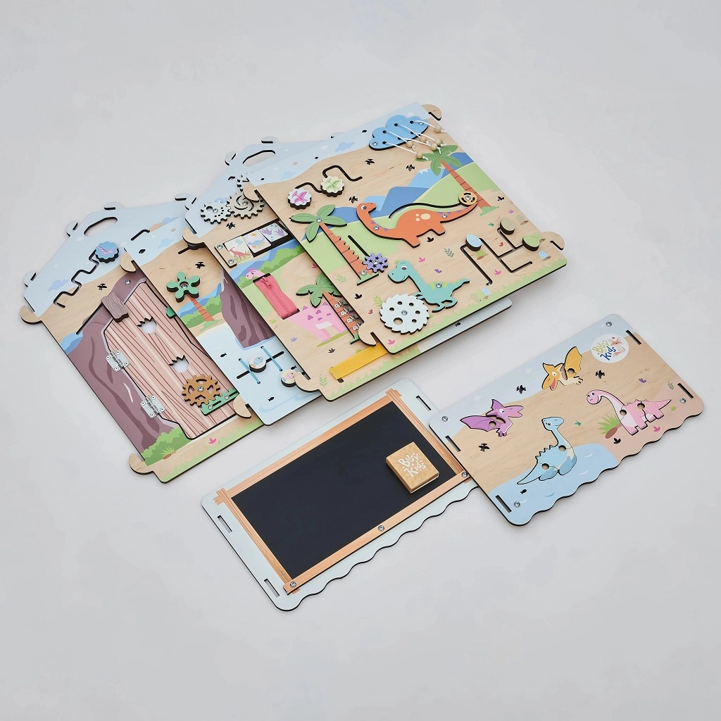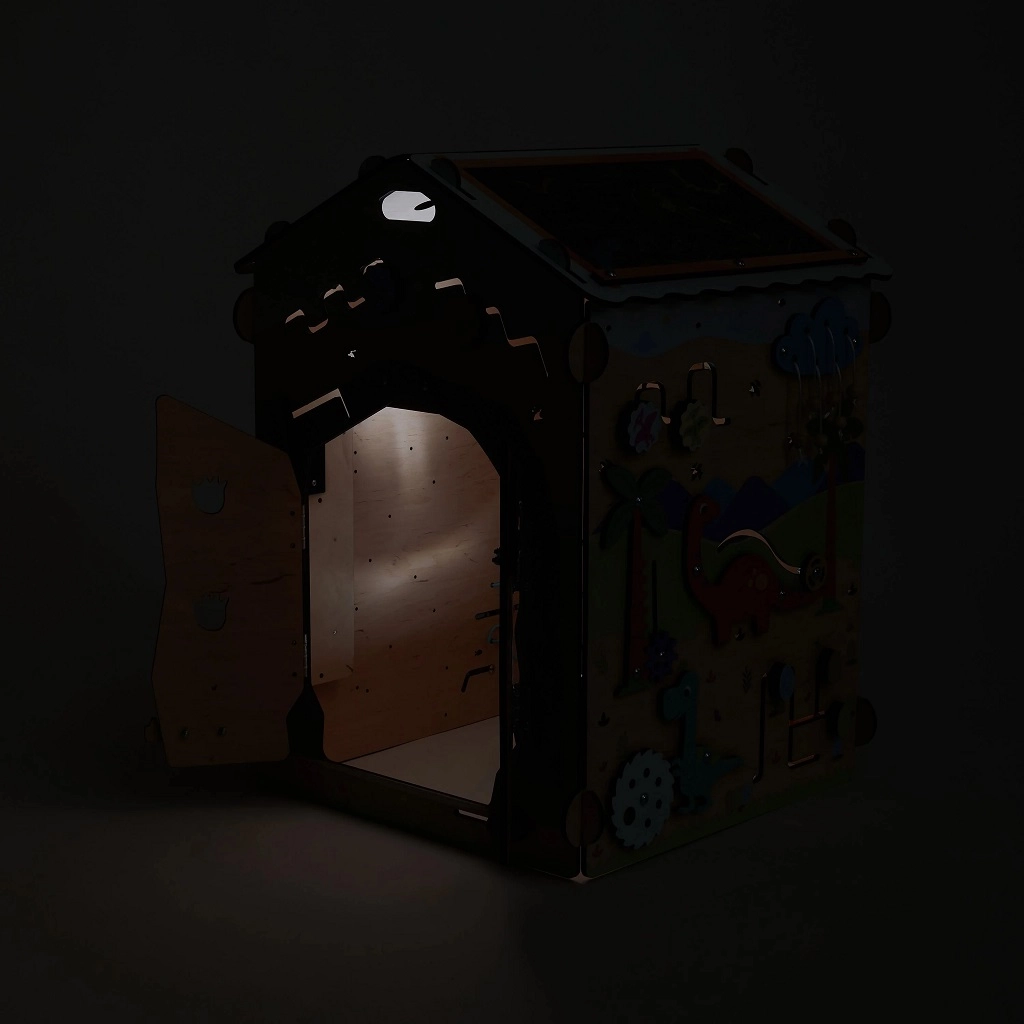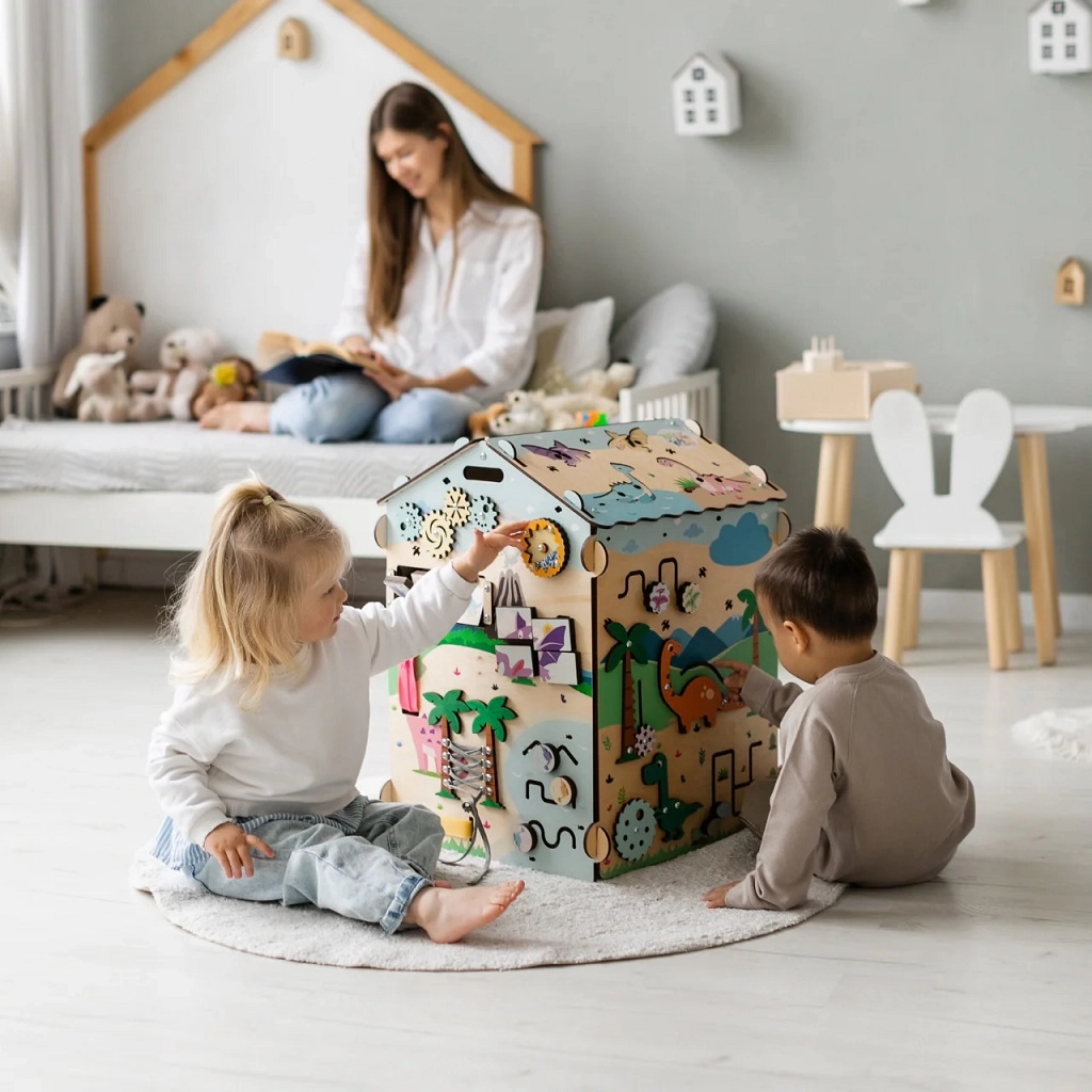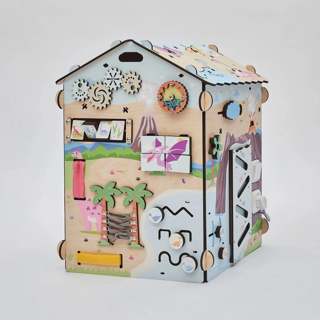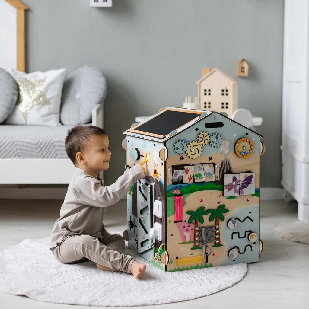 BusyKids aktivt hus DINO kombinerer Montessori-principper med et rigt udvalg af aktiviteter, som naturligt leder børn til at udforske. Med lyselementer, tavle på taget og dinosaur-indlægsbrikker træner børn fokus, tålmodighed og kreativitet, mens de har det sjovt.
