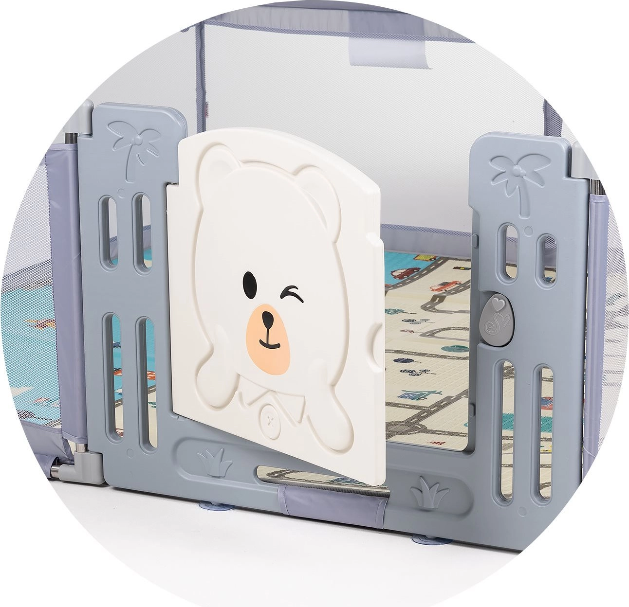 Den solide plastlåge med sødt motiv og sikker lås gør ind- og udgang let. To støtteringe hjælper barnet med at træne motorik, greb og de første skridt. Produktet opfylder standarden EN 12227:2010, så du har garanti for dokumenteret sikkerhed.