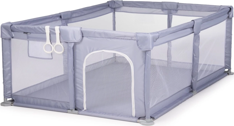 Den stabile, forstærkede ramme med afrundede hjørner og blød polstring øger både sikkerhed og komfort. Børnegården er let, nem at samle og nem at vedligeholde – ideel til stuen og på farten. I pakken medfølger også 2 griberinge, som hjælper barnet med at trække sig op og øve at stå.
