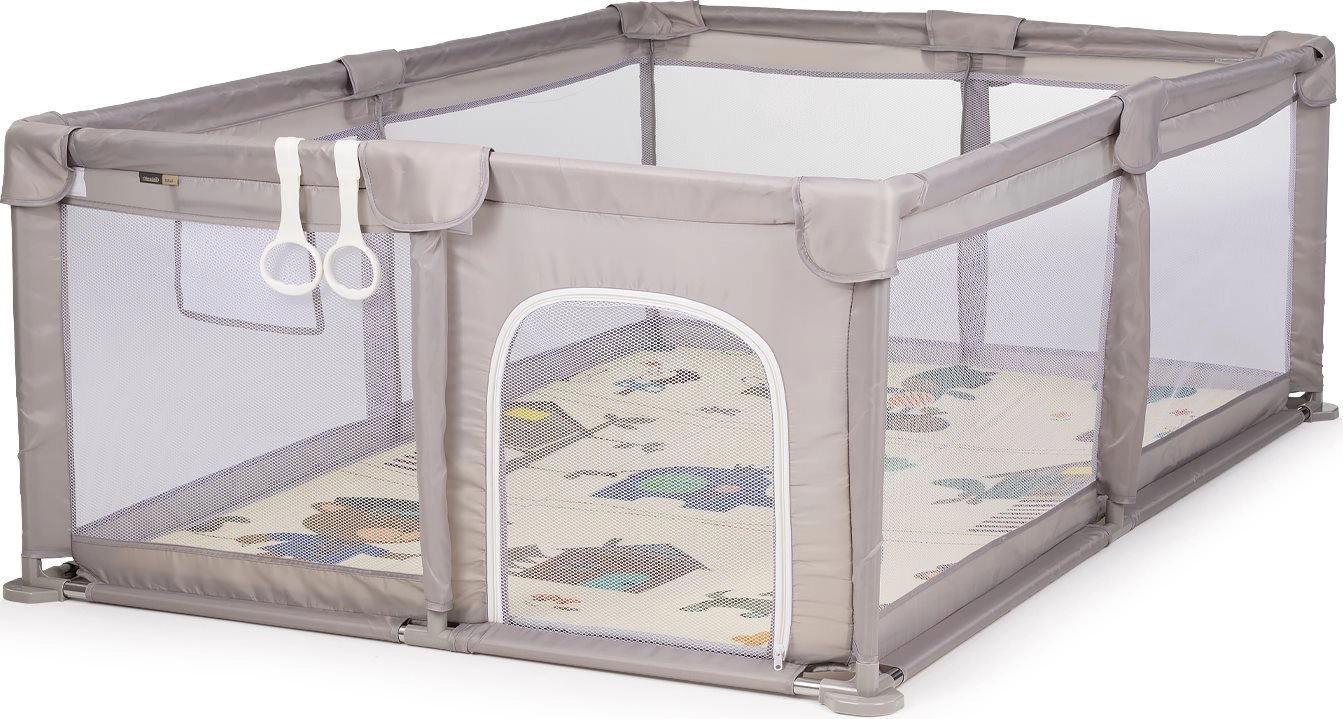Den stabile, forstærkede konstruktion med blød polstring og afrundede kanter er designet med fokus på sikkerhed og komfort. Børnegården er let, nem at samle og let at vedligeholde. I pakken medfølger 2 praktiske ringe, som fastgøres på den øverste kant og hjælper barnet med at trække sig op og øve de første stå-forsøg.