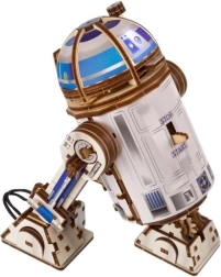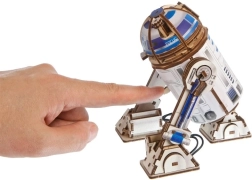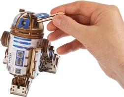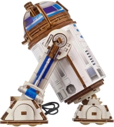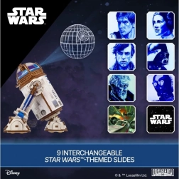Den legendariske droid R2‑D2 vækkes til live i en træmodel, der trofast gengiver det ikoniske design fra STAR WARS‑universet. Takket være optræksmekanismen bevæger droiden sig virkelig fremad efter aktivering med “start/stop”‑armen og leverer en jævn bevægelse, mens LED‑projektoren viser farverige scener fra en galakse langt, langt borte. Diasene er sikkert opbevaret i droidens krop og skiftes nemt med det medfølgende værktøj.