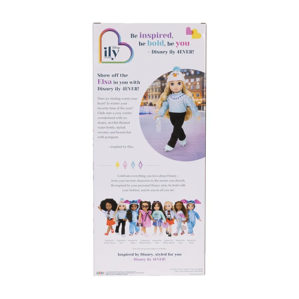 Oplev vintermagi med den store Disney ILY 4Ever-dukke inspireret af Elsa fra Frost. Et stilfuldt vinteroutfit, blå skøjter, hue med Olaf-motiv og lange blonde hår der kan friseres, sikrer timevis af kreativ leg. Ideel gave til børn fra 6 år og et fantastisk supplement til børneværelsets samling.