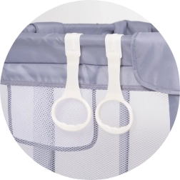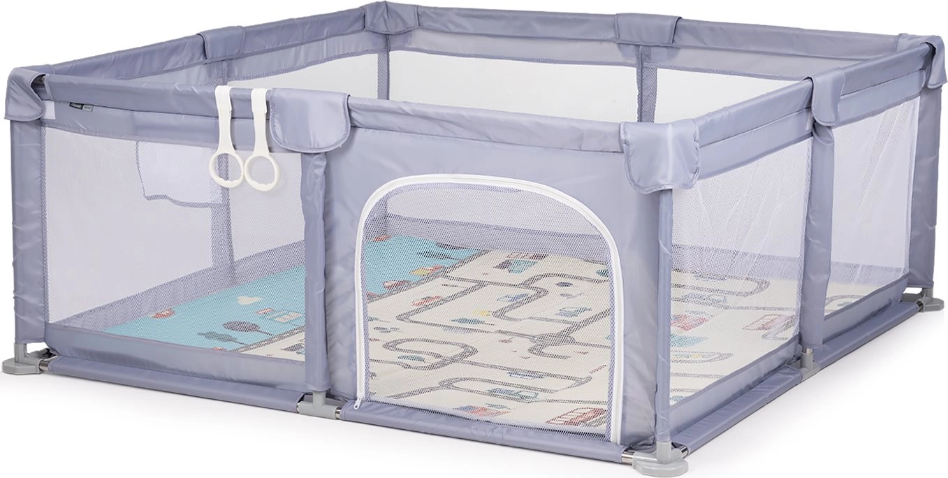 Praktisk og sikker børnegård til daglig leg og hvile. Den byder på rumligt kvadratisk design, sideåbning med lynlås for nem adgang, åndbare netpaneler og forstærket ramme med blød polstring. Der medfølger 2 griberinge til træning i at rejse sig. Opfylder standarden EN 12227:2010.