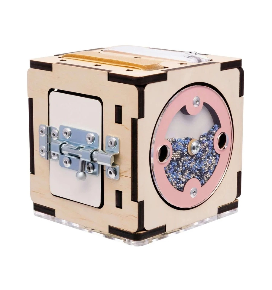 En metal-skyderigle og hængsler styrker små fingre, tålmodighed og logisk tænkning, når lågen åbnes og lukkes.