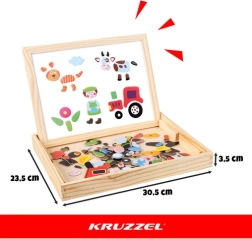 Kreativ dobbeltsidet KRUZZEL-tavle til børn fra 3 år kombinerer en hvid magnetisk flade til at lægge former og skrive med tusch med en sort kridtside til tegning. I sættet er der 108 farverige magnetiske dele, tørtusch, kridt, svamp og en praktisk trækasse til opbevaring. En fantastisk hjælp til finmotorik, logisk tænkning og kreativitet uden skærme.