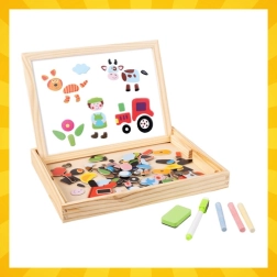 Opdag et smart legetøj, der vokser med dit barn. Den dobbeltsidede tavle byder på to verdener af sjov – en hvid magnetisk side til at lægge dyr, figurer og køretøjer samt skrive med tørtusch, og en sort kridtflade til fri tegning. Alt opbevares i en kompakt trækasse, som også fungerer som stander.