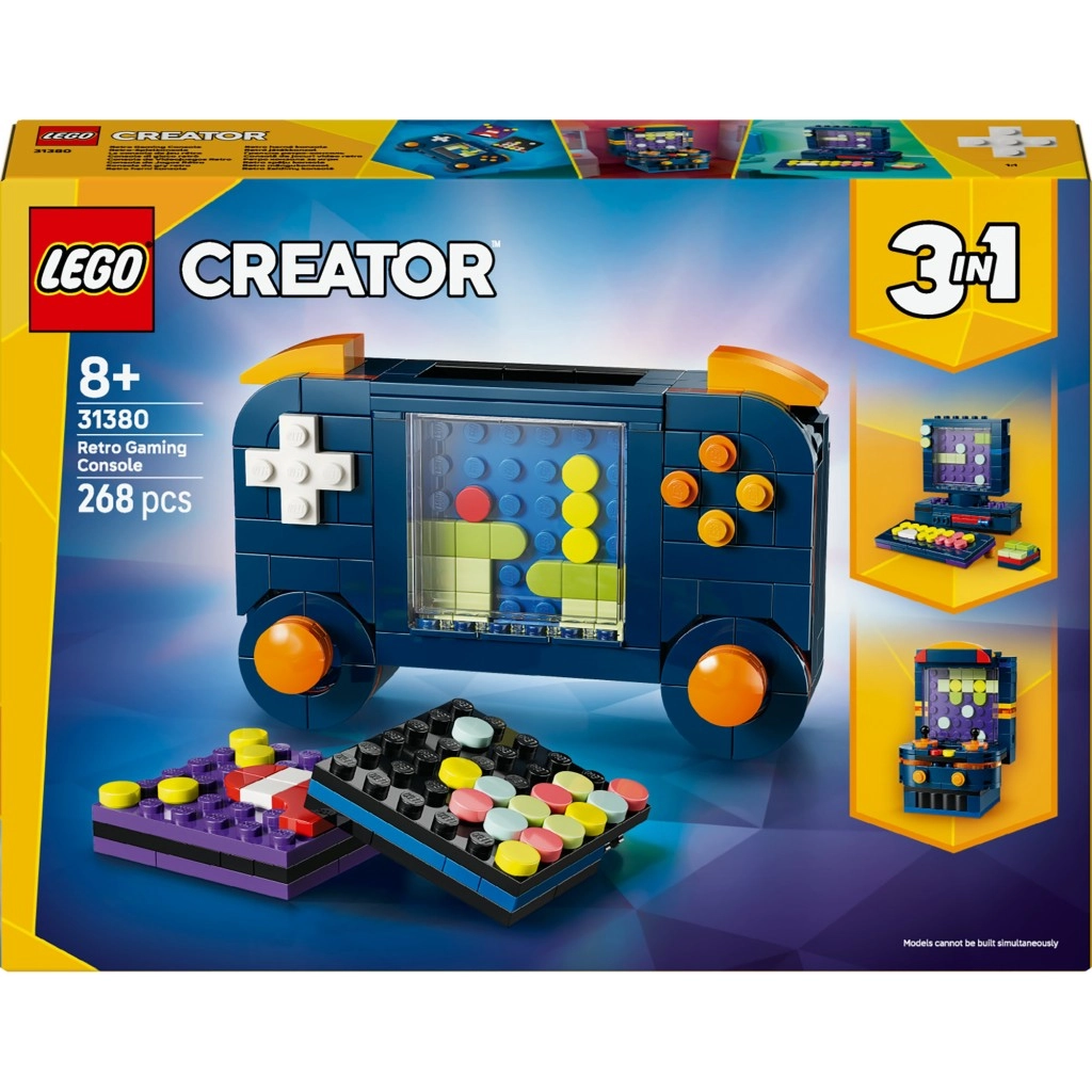 Dette designersæt i mørkeblå med markante orange detaljer byder på en farverig bygge- og legeoplevelse. Den bærbare konsol har to bevægelige joysticks, fire orange knapper og et gennemsigtigt panel som skærm, hvor der kan indsættes tre forskellige spilmoduler med unikke mønstre.