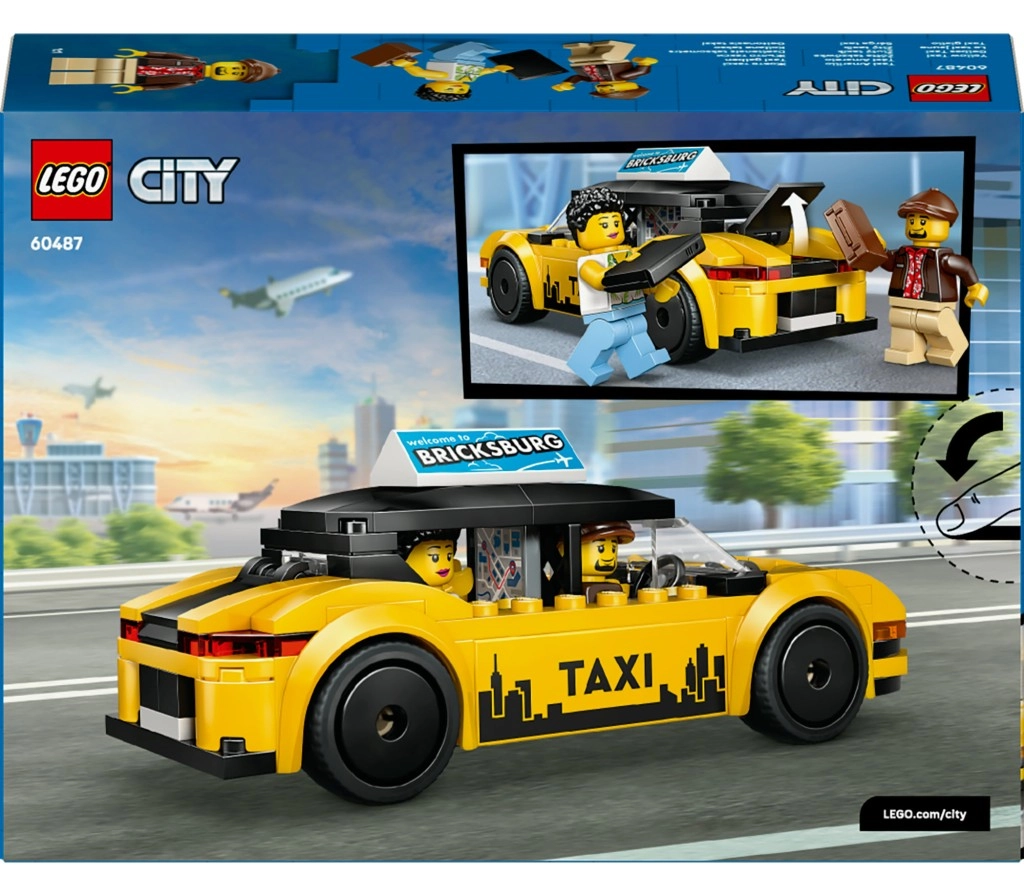 Det gule design med sorte striber, teksten TAXI og reklamepanelet “Welcome to Bricksburg” giver modellen et realistisk udtryk i enhver LEGO City-scene.