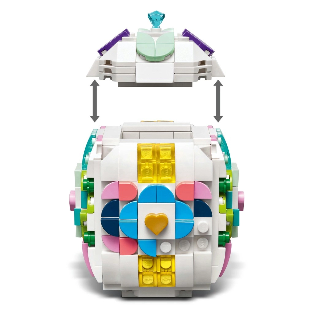 Dette elegante hvide æg af LEGO klodser er cirka 10 cm højt og 7,9 cm bredt – en ideel størrelse til hylden, bordet eller en påskeopsats. Med et rigt udvalg af pastelfarvede og transparente elementer (hjerter, blade, “diamanter”) kan du nemt skabe et originalt mønster og ændre det når som helst.
