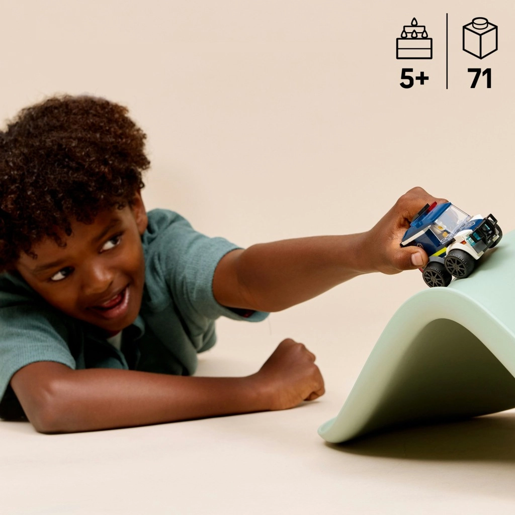 Nyd actionfyldte jagter med LEGO City biler – politivogn. Sættet med 71 dele til børn fra 5 år byder på nem bygning, robust konstruktion og et autentisk politilook med store hjul, udrykningslys og plads til en politiminifigur. Et godt valg til kreativ leg hjemme og på farten, kompatibelt med LEGO Builder appen.