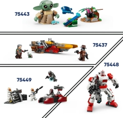 Dette sæt, inspireret af første sæson af STAR WARS: THE MANDALORIAN, gengiver trofast den ikoniske speeder fra Tatooine. Der medfølger en minifigur af Mandalorianeren med sølvfarvet hjelm, kappe og en blasterriffel samt den charmerende Grogu i en taske ved motorcyklen til autentiske scener og egne eventyr.