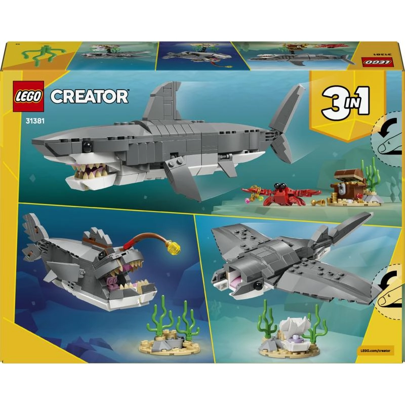 Tag på undervandseventyr med byggesættet LEGO Creator 3-i-1, som giver børn fra 8 år 3 modeller i ét sæt: en bevægelig haj med skattekiste, en frygtindgydende søslange eller en elegant manta. Med 379 elementer kan børn nyde kreativt byggeri, flot udstilling på en stand og endnu mere leg med appen LEGO Builder.