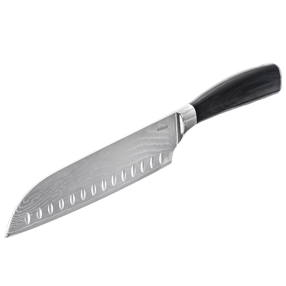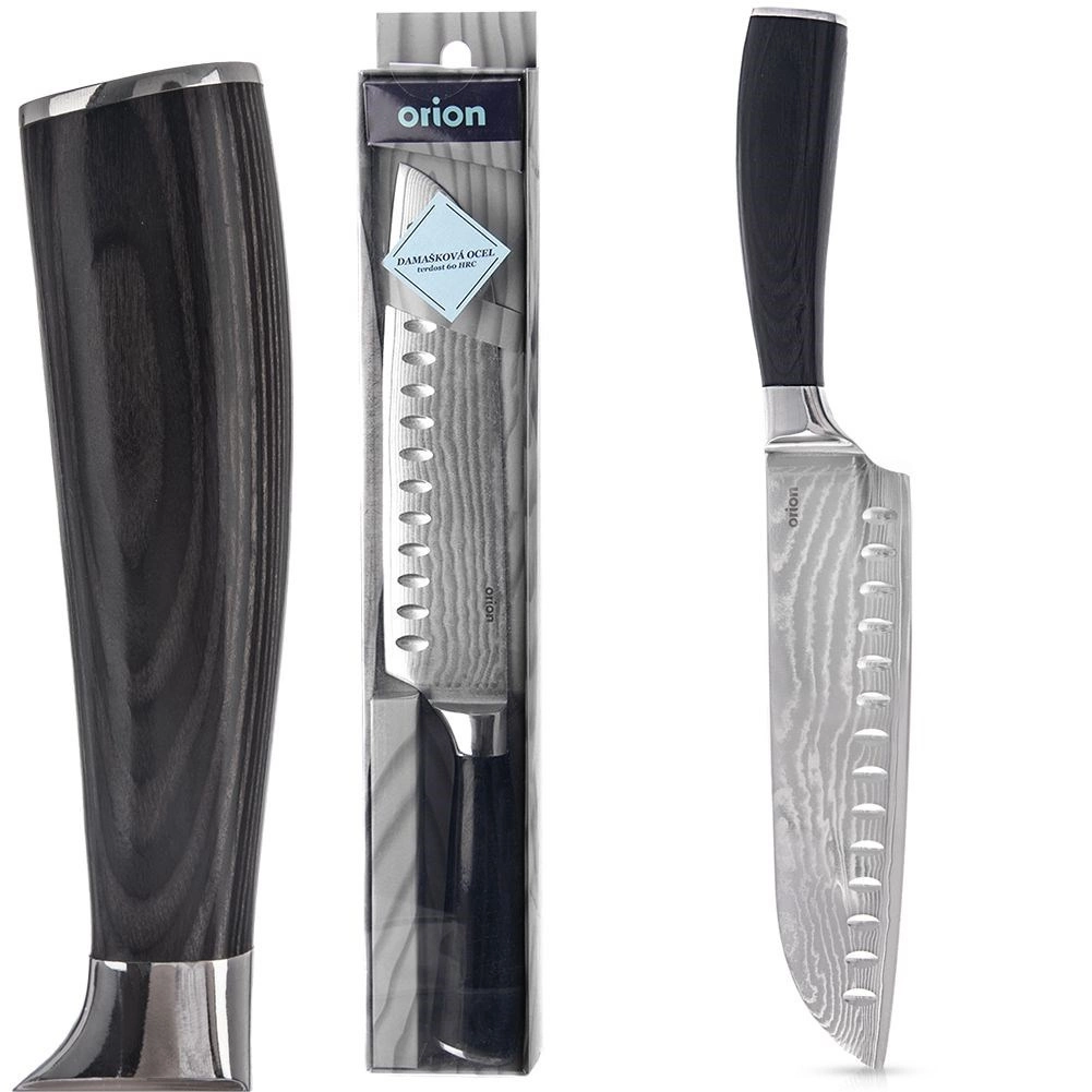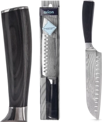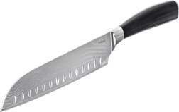 Præcis santoku-køkkenkniv med en samlet længde på 31 cm og et 18 cm blad af 67-lags damaskusstål for enestående skarphed og holdbarhed. Det ergonomiske pakkatræskaft ligger perfekt i hånden, og granton-udfræsninger på klingen minimerer, at mad klæber fast. Ideel til hakning, skæring og udskæring af frugt, grøntsager og kød i både hjemme- og professionelle køkkener.