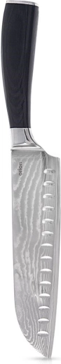 Santoku-kniven kombinerer japansk inspiration med europæiske forarbejdningsstandarder. Det 67-lags damaskusstål giver ekstraordinær hårdhed, modstandsdygtighed og langvarig skarphed, mens den flade klingegeometri gør præcise snit og hurtig forberedelse nemmere. Takket være granton-fordybninger klæber skiverne ikke til klingen, og skæringen bliver jævn.