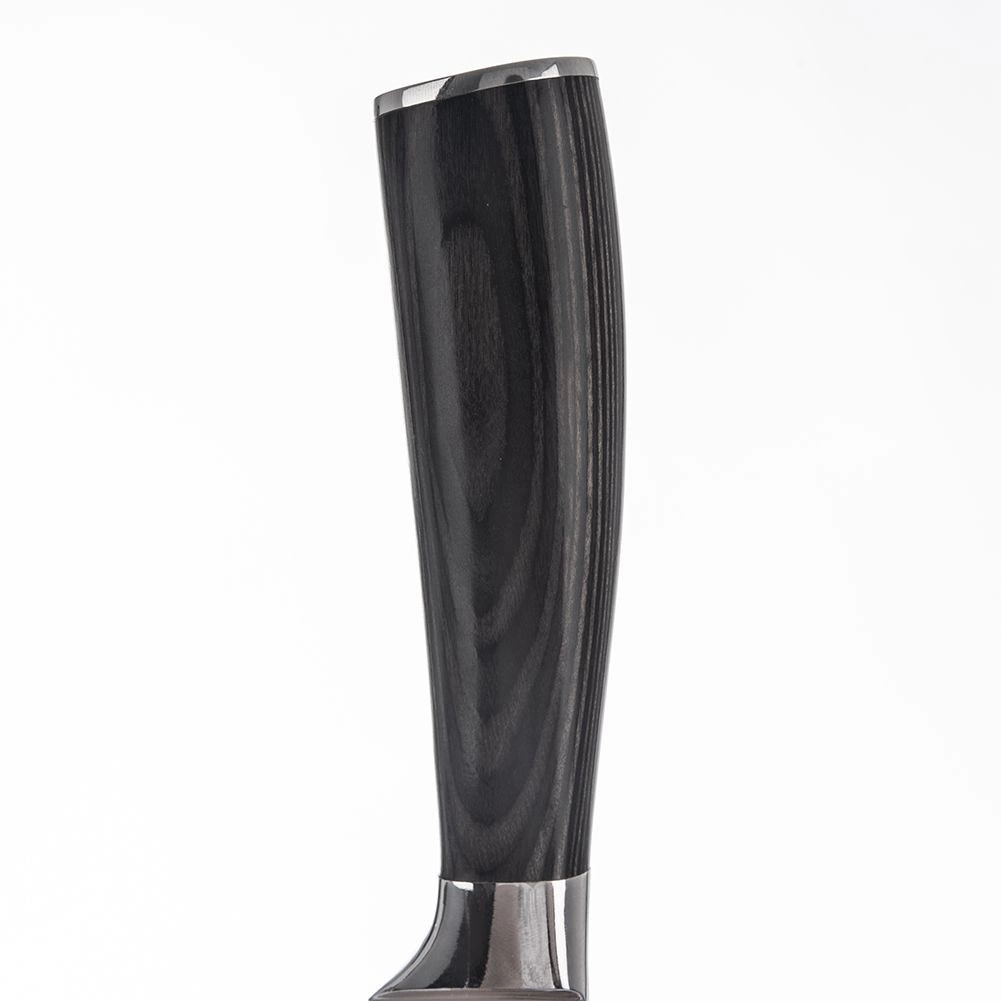 Håndtaget af pakkatræ er modstandsdygtigt over for fugt, varme og kemikalier, og den ergonomiske form giver et sikkert greb og maksimal kontrol. Kniven er et alsidigt valg til hverdagens opgaver – fra fin udskæring til hakning af urter og udskæringsopgaver.