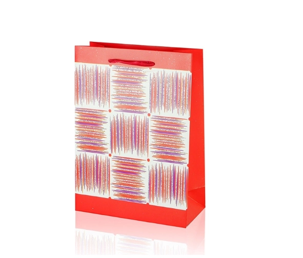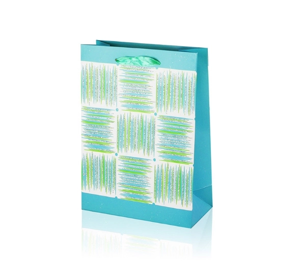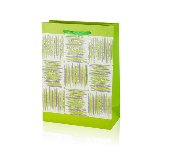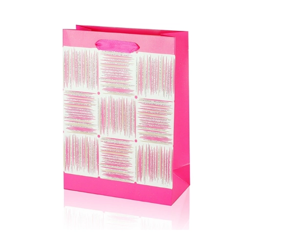 Denne A5-gavepose kombinerer praktiske mål med et attraktivt design. Den blanke overflade, det dekorative panel med striber og båndhåndtagene giver din gave et premium udseende. Posens foldesider og solide bund sikrer stabilitet, når du lægger ting i den.