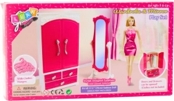 Elegant møbelsæt til dukker på ca. 29 cm inkluderer et garderobeskab med åbningsbare døre og skuffer, et fritstående spejl med stabil base og et sæt bøjler. Holdbar plastkonstruktion, charmerende rosa-hvid farvekombination og detaljer til kreativ leg og organisering af dukketøj.