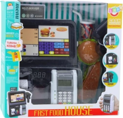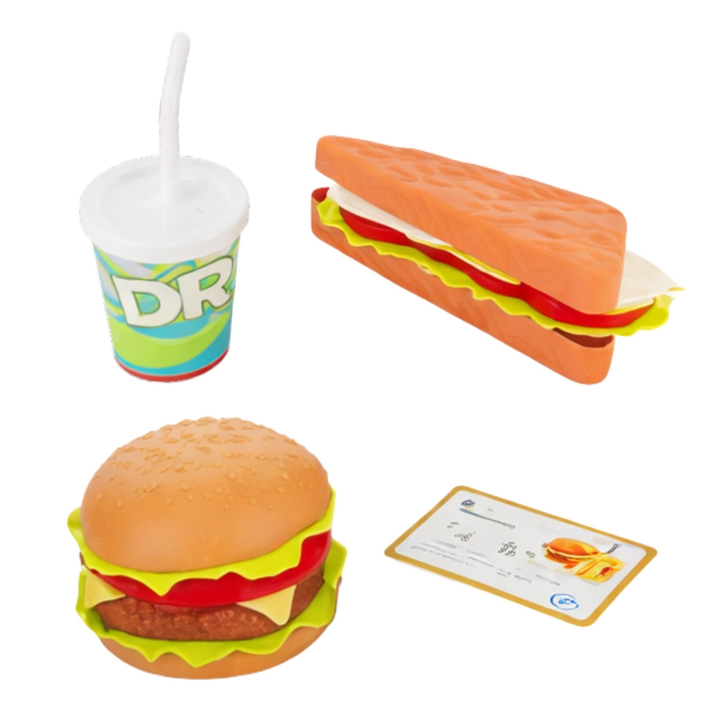Medfølger: kasseapparat med display, POS-terminal, håndscanner samt et sæt plastikmad og drikke til tematisk FAST FOOD-leg. Det holdbare plastmateriale er sikkert og egner sig til hjemmebrug og børnehaver.