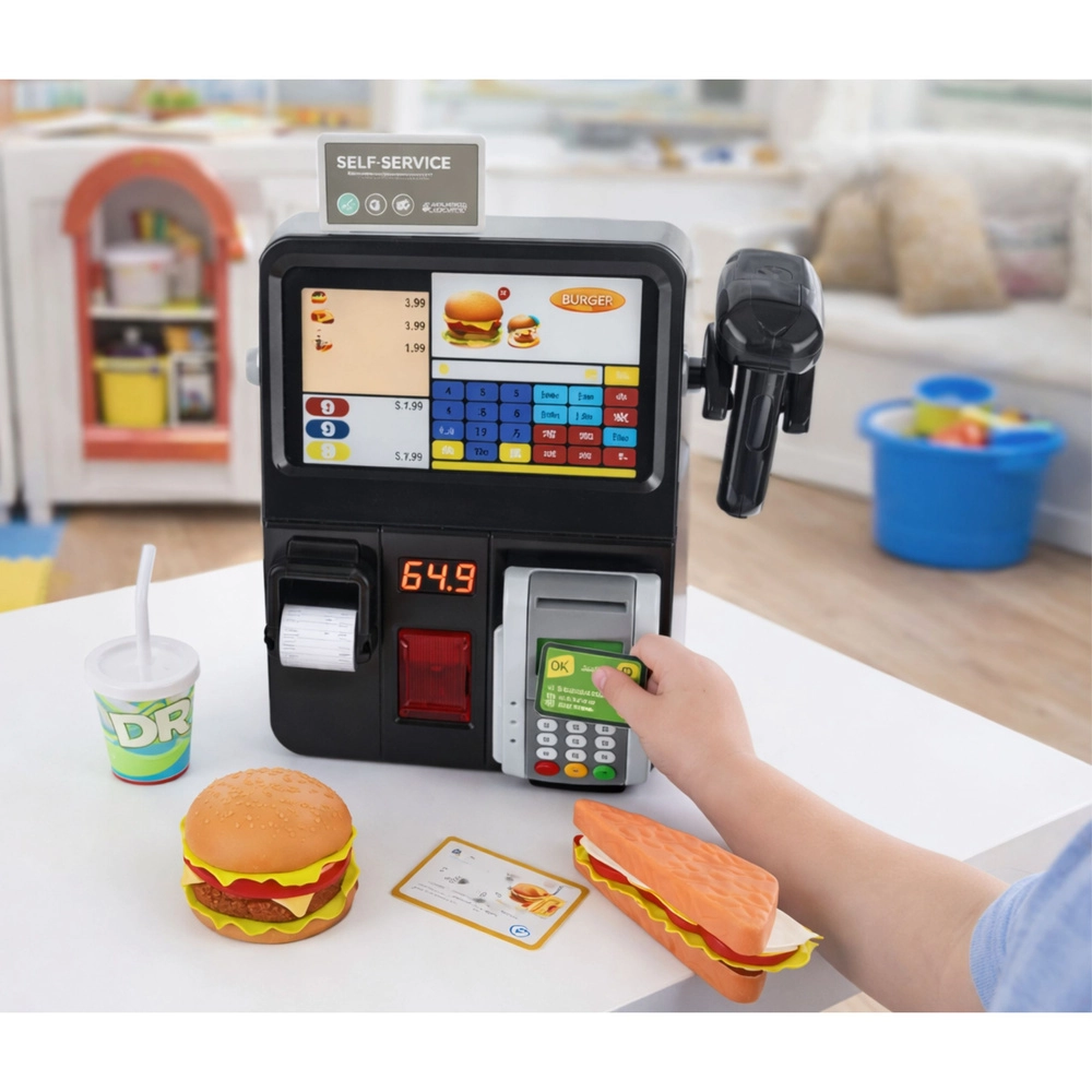 Denne selvbetjeningskasse til børn er ideel til små ekspedienter og kokke. Realistiske funktioner – fra scanning og udskrift af kvitteringer til kortbetaling – skaber en autentisk stemning af butik eller fastfood. Med lys- og lydeffekter bliver legen dynamisk og fængende.