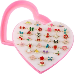 Dette farverige sæt ringe vil glæde alle små pyntesjæle. Takket være den justerbare diameter tilpasses ringene nemt til børnefingre og giver behagelig og sikker brug. Det transparente låg på det hjerteformede etui muliggør overskuelig opbevaring og hurtig udvælgelse af yndlingsmotiver.