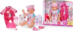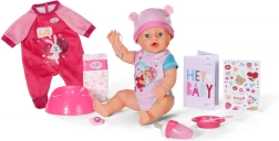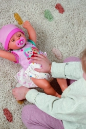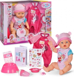 Den populære dukke BABY born Emma 43 cm i en blid lyserød bodystocking bringer masser af interaktiv sjov. Hun kan drikke af flasken, græde, bruge potten, og takket være den magiske tallerken dukker der “mad” op, når man hælder vand på, for realistisk fodring. Hendes øjne åbnes og lukkes med en magisk sut, og når hun lægges til at sove, lukker hun dem selv. Hun er bøjelig, egnet til bad og nem at rengøre.