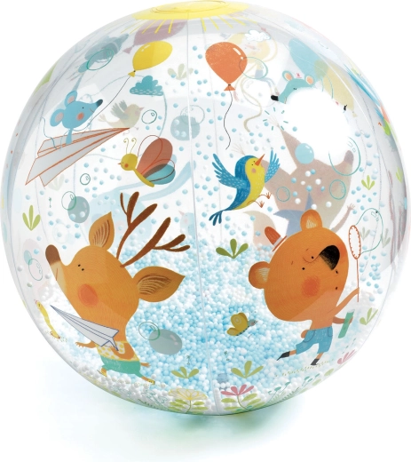 Den oppustelige bold med perler fra DJeco giver børn masser af bevægelse og glæde. Den gennemsigtige overflade skjuler små perler, som ved kast og rul skaber en legende effekt og motiverer børn til aktiv leg.