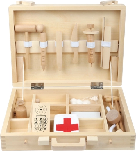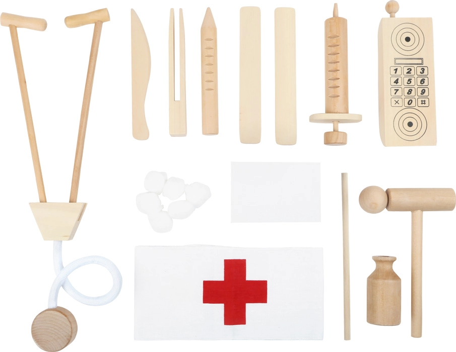 Den træbaserede doktor-kuffert SMALL FOOT giver børn en autentisk oplevelse af lægeklinikken. I den elegante trækuffert med klassiske lægesymboler finder de små læger redskaber, legetøjstelefon og sprøjter – alt sikkert til børns leg. Den høje kvalitet og de glatte kanter gør sættet ideelt til daglig leg.