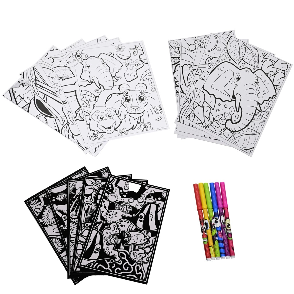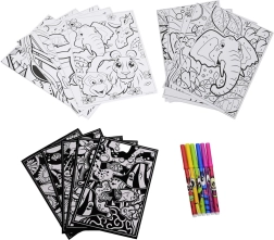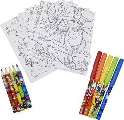 Børn kan tegne med tuscher, farvelægge efter tal, afsløre farverige motiver ved at skrabe eller pynte billeder med klistermærker, pomponer og piberensere. Alle skriveredskaber er ikke-giftige og sikre for børn fra 3 år.