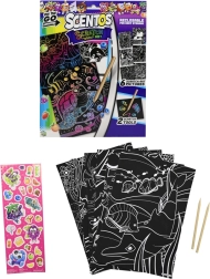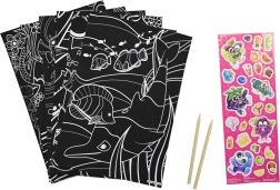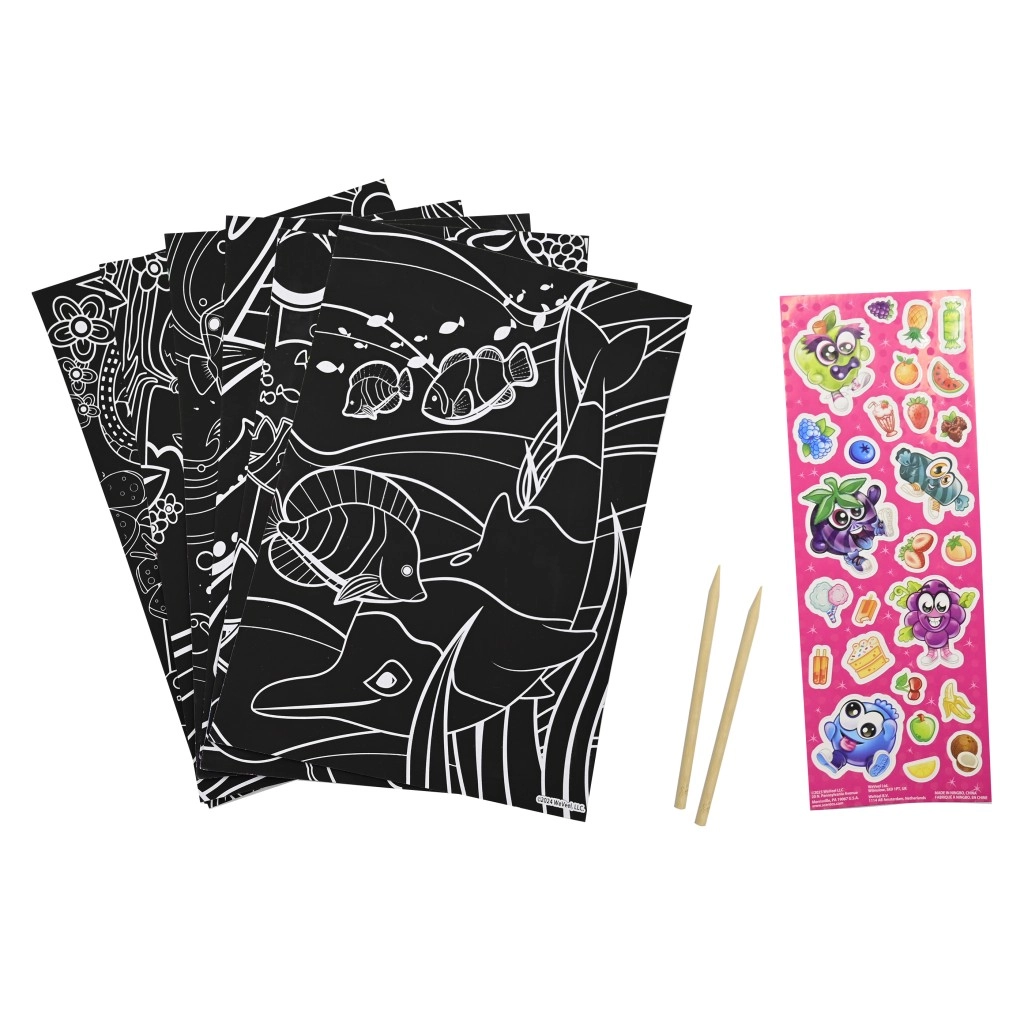 De sorte kort afslører strålende farver, når de skrabes. Der medfølger træstylusser og klistermærker til yderligere udsmykning.