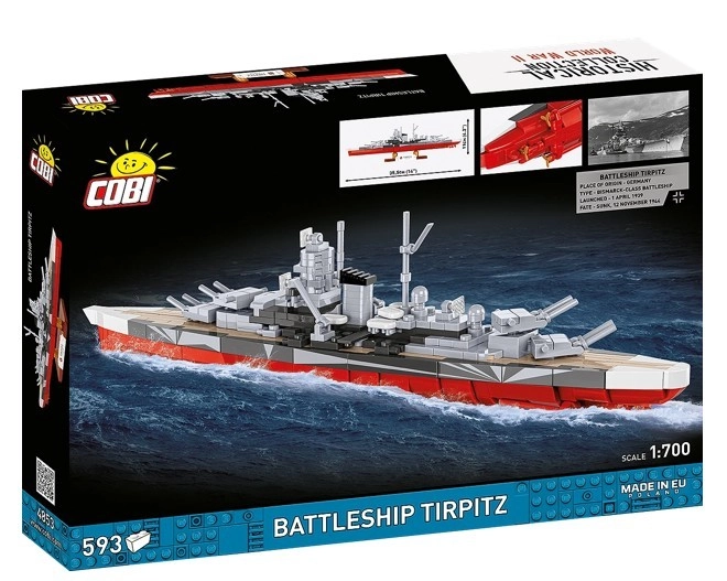 Byg det legendariske tyske slagskib TIRPITZ i skala 1:700 af 593 kvalitetsklodser. Modellen udmærker sig ved detaljeret udførelse, holdbare print uden klistermærker, bevæbning med bevægelige dele og elegant stander med navneplade til effektfuld udstilling. Ideel til fans af WWII-historie, samlere og entusiastiske byggere.