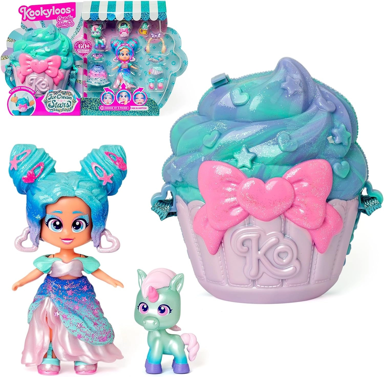 Figuren KookyLoos Candy Cream Stars bringer en legende kombination af stil og fantasi. Pastelfarver, tema med ispinde og stjerner og muligheden for at ændre look stimulerer børns fantasi og kreativitet. Takket være den praktiske cupcake-formede håndtaske kan børn tage deres yndlingsfigur med overalt.
