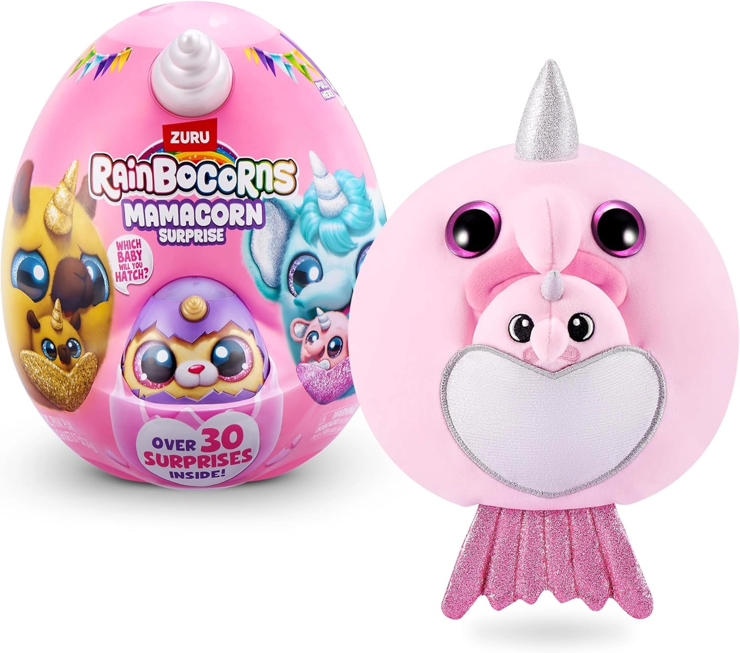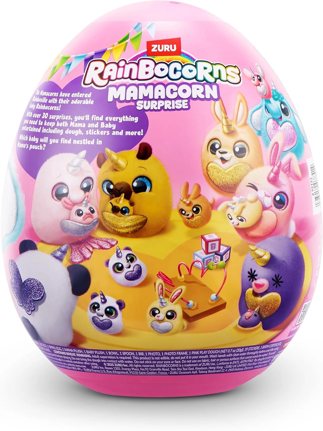 Opdag den magiske verden af RAINBOCORNS MAMACORN SURPRISE – et stort lyserødt æg, hvor en Mamacorn‑mor venter med sin baby og mere end 30 overraskelser. En blød, lækker og samlerbar plysdyr med et magisk hjerte på maven, der giver timevis af kreativ og følelsesladet leg. Ideel som gave til børn fra 3 år.