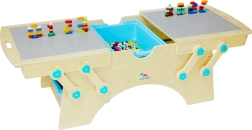 Trælegebord til børn fra 3 år med to legeoverflader og rummelige opbevaringskasser – perfekt til kreativ byggeleg. Det er kompatibelt med klodser fra LEGO, QMAN, SLUBAN, L-W og flere, har et sikkert design med afrundede kanter og en robust konstruktion. Der medfølger også et byggesæt til leg med det samme samt en detaljeret samlevejledning.