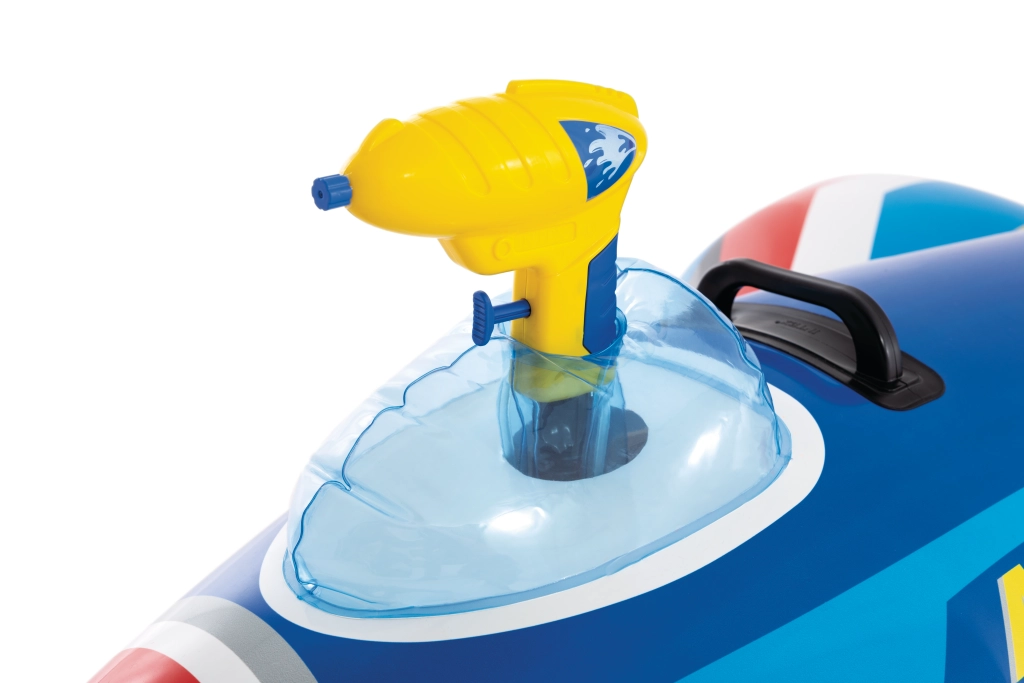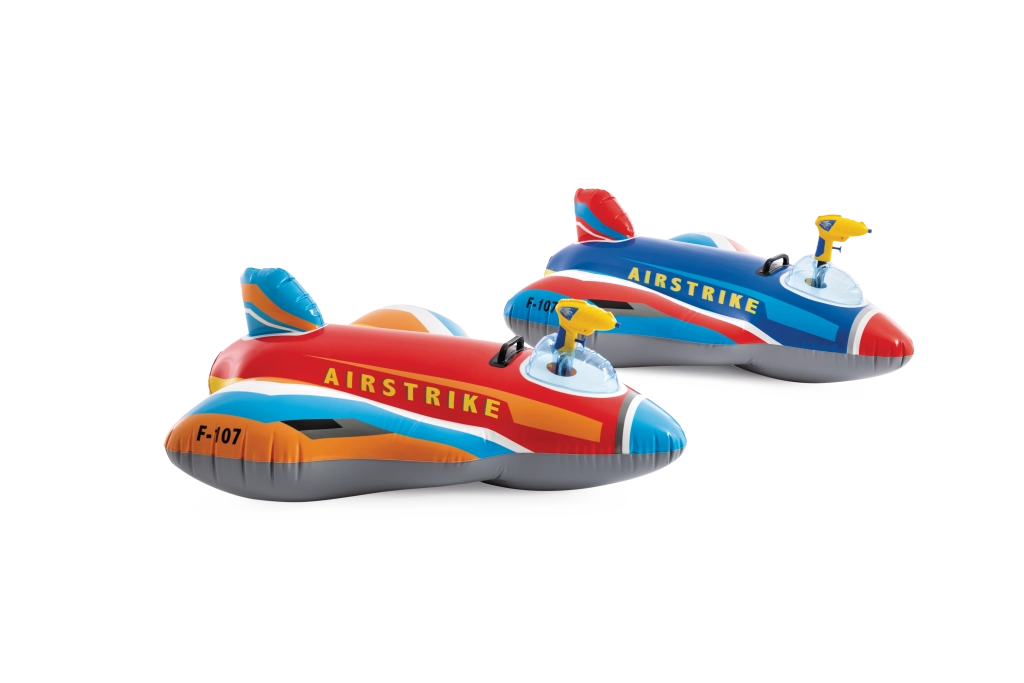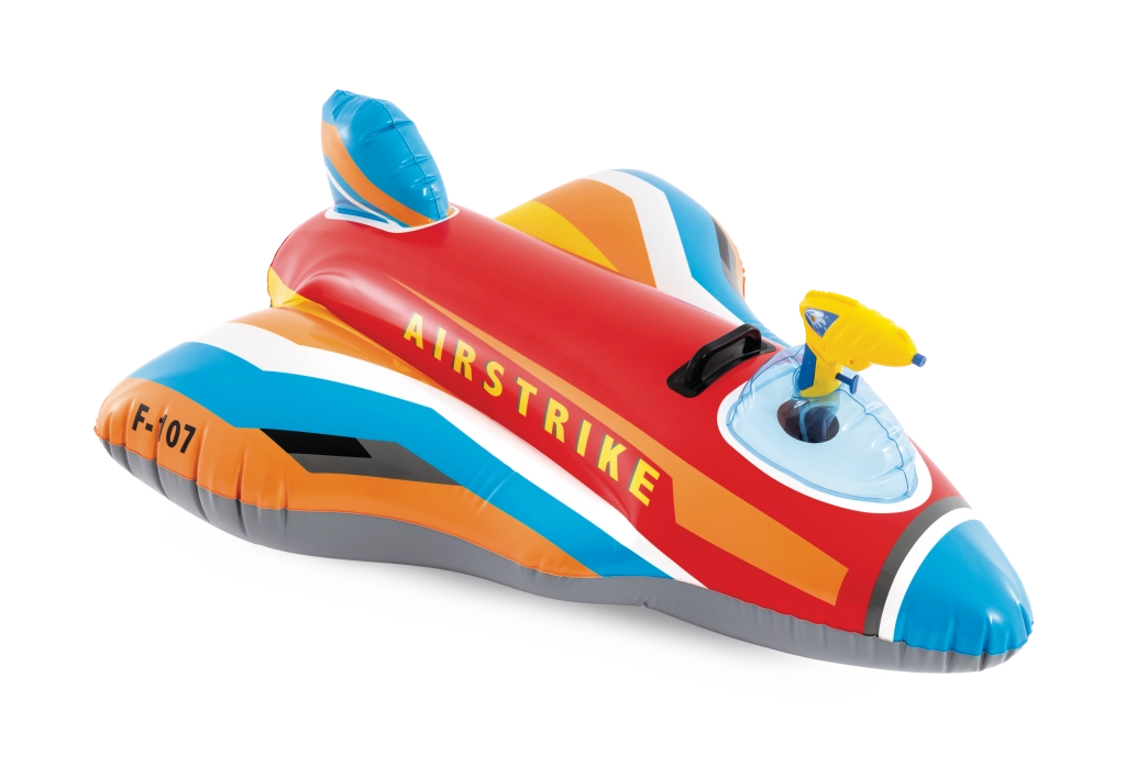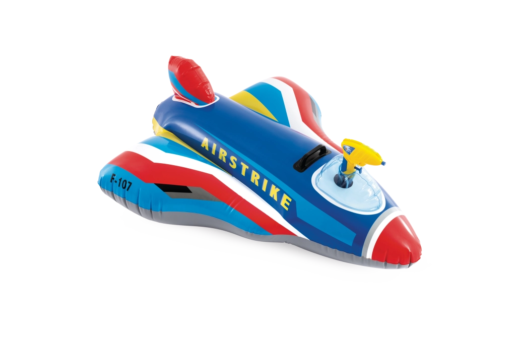 Den oppustelige jager AIRSTRIKE F-107 forvandler enhver pool til en actionfyldt landingsbane. Takket være de brede vinger og den bageste stabilisator er den meget stabil og behagelig for mindre børn. Den integrerede vandpistol i cockpittet gør det nemt at sprøjte vand og sørger for endeløs underholdning.