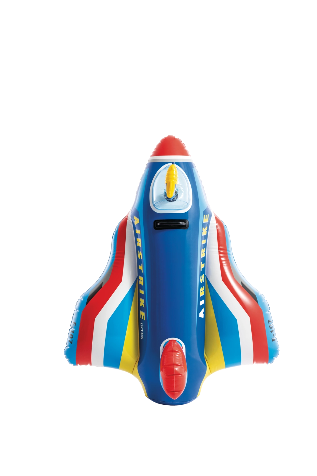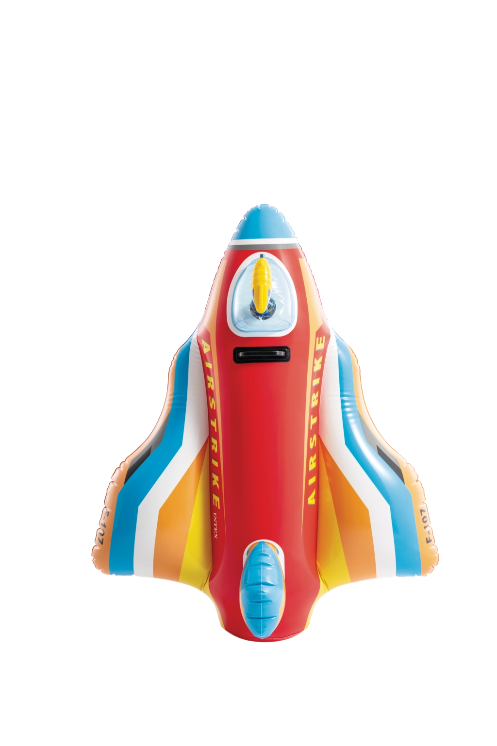 Den robuste konstruktion i kvalitets-PVC og det solide håndtag sikrer tryggere leg og bedre kontrol under sejlads. De klare farver i rød, blå, gul og hvid samt teksterne AIRSTRIKE og F-107 giver legetøjet et attraktivt udseende, der straks fanger børns opmærksomhed.