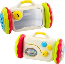 Det interaktive spejl på hjul motiverer børn til at krybe og kravle, udvikler grov- og finmotorik og understøtter koordinationsevner. Det sikre spejl vækker selvrefleksion og nysgerrighed, mens farverige detaljer og raslende kugler stimulerer syn og hørelse.