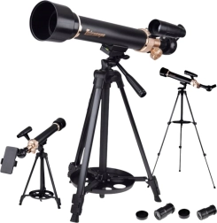Dette refraktorteleskop kombinerer en robust aluminiums-konstruktion med glidende fokus og vinkeljustering for komfortabel og præcis observation. Takket være det højdejusterbare stativ (op til 1,35 m) er det velegnet til unge entusiaster og voksne, både til natlig astronomi og til daglig observation af landskab og natur.