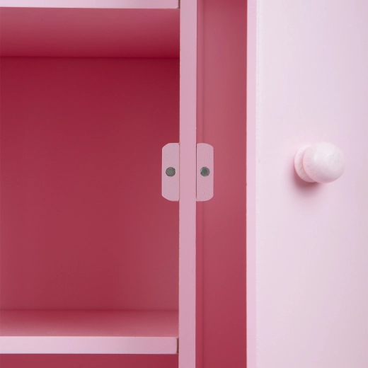 Dette kvalitets dukkeskab i blid lyserød er ideelt til overskuelig opbevaring af tøj og tilbehør til dine dukker. Venstre del har to praktiske hylder, højre side er udstyret med en tøjstang til kjoler. Døren med magnetlukning er let at betjene, og udskæringer af stjerne og måne giver møblet et charmerende udtryk.