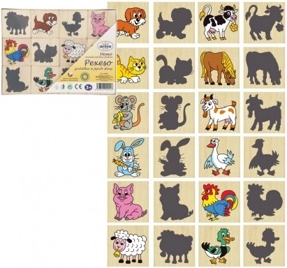 Pexeso af træbrikker med tryk af dyr og deres skygger. Hjælper med at udvikle dine børns fantasi og hukommelse på en sjov måde.