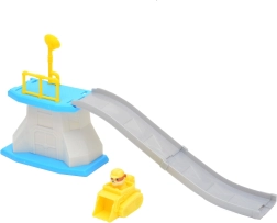 Den buede grå rampe med blå platform og gult gelænder sikrer en glidende nedkørsel for køretøjet og masser af dynamisk sjov.