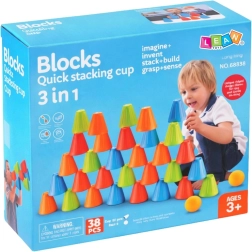 Dette færdigheds- og læringsspil tilbyder uendelige muligheder for byggeri og leg. Børn kan af farvede trekantede kopper skabe tårne, pyramider og forhindringsbaner, øve balance og præcision eller kaste bolde i udvalgte mål. Den skridsikre overflade med fin perforering sikrer et sikkert greb og stabilitet i konstruktionerne.