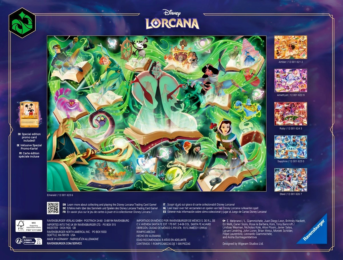 Oplev en detaljeret illustration fra DISNEY LORCANA i udgaven Glimmers of the Realm: Smaragd. RAVENSBURGER puslespil imponerer med førsteklasses trykkvalitet og præcis udskæring, så brikkerne passer perfekt sammen og helheden holder formen. Det færdige billede måler cirka 70 × 50 cm og egner sig fint til indramning.