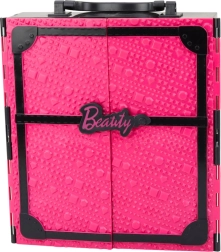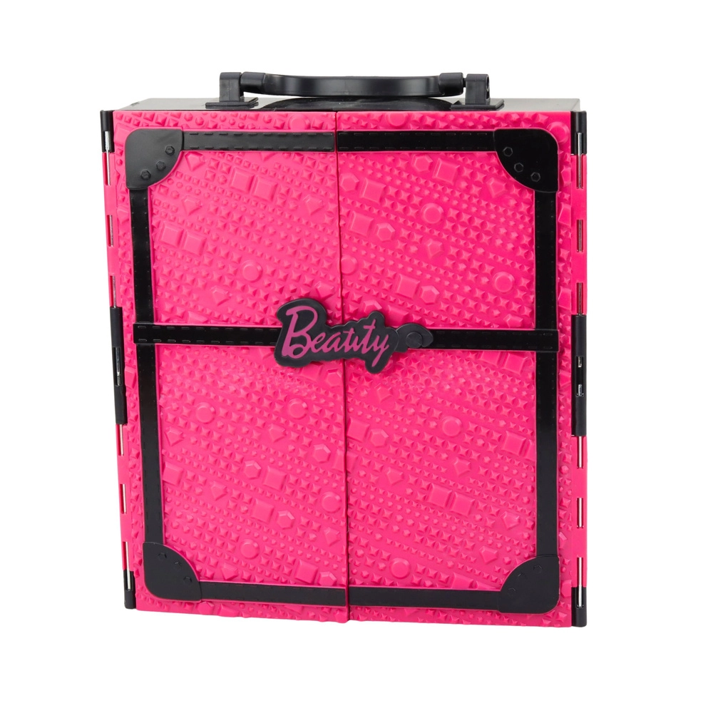 Den foldbare lyserøde garderobe kombinerer et dukkehus og et transportabelt klædeskab til dukker. Når den åbnes, skabes et overskueligt område med hylder, skuffer og bøjler, som inspirerer til at skabe outfits og holde orden. Sættet inkluderer en stor dukke (ca. 30 cm) og et udvalg af elegante kjoler, sko, tasker og smykker.