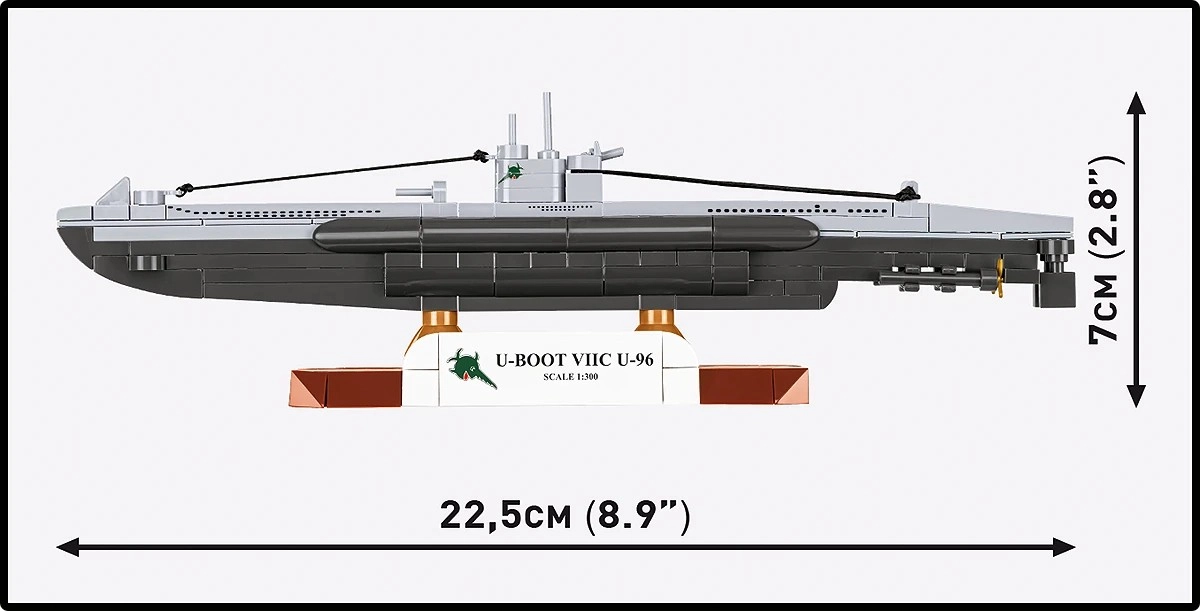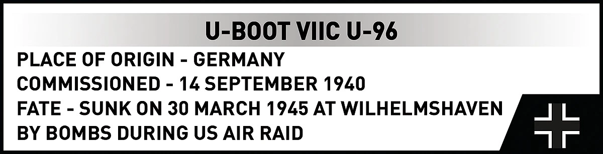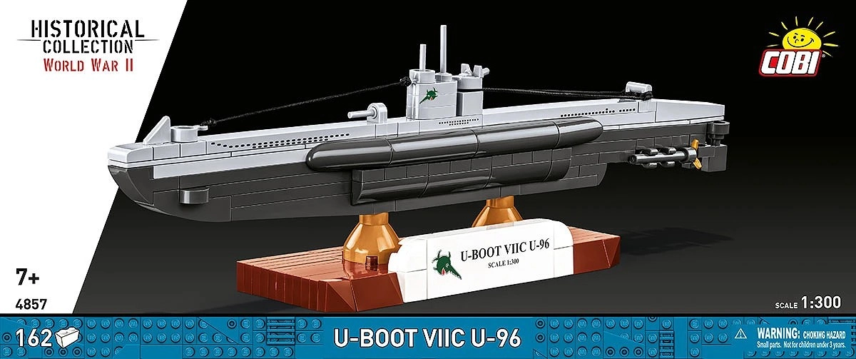 Byg den legendariske ubåd U-BOOT VIIC U-96 i skala 1:300 af 162 klodser. Et kvalitetsbyggesæt fra Europa, som vil glæde samlere, historieentusiaster og fans af filmen Das Boot. Det byder på realistiske skrogsdetaljer, tårn med periskop og en elegant stander til fremvisning af modellen.