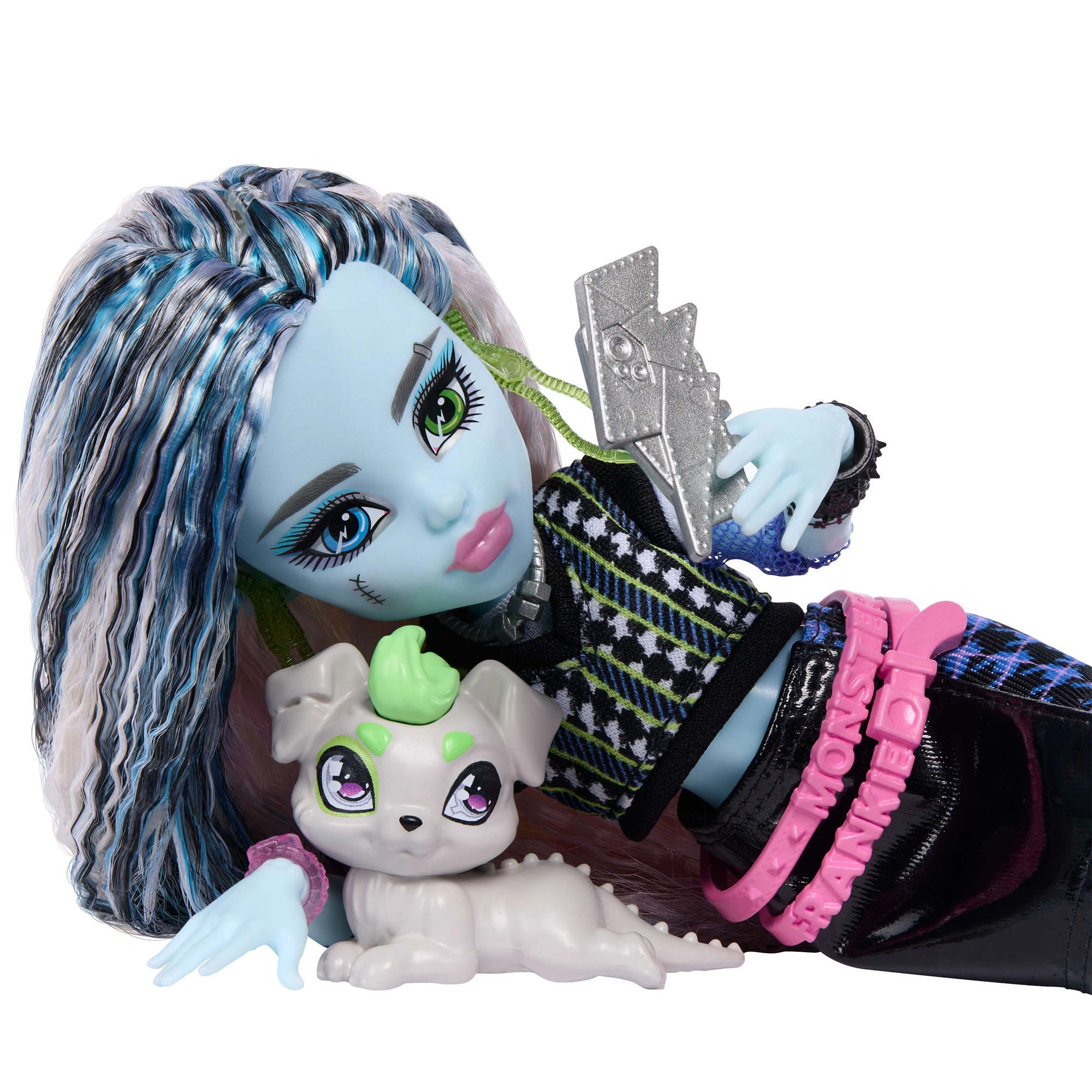 Frankie Stein fra MONSTER HIGH serverer en elektrificerende modestil fra top til tå. Hun har langt, flerfarvet hår, et kontrastfyldt outfit med markante detaljer og masser af tematisk tilbehør – fra solbriller og crossbody-taske til telefon og høretelefoner. Der medfølger også et trofast kæledyr, der bringer historierne fra Monster Highs skolegange til live.