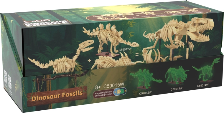 Byggesættet CaDA Dinosaur Fossils glæder både små og store fans af forhistorien og lærende modeller. Af kvalitetsdele bygger du tre imponerende skeleteksemplarer med leddelt bevægelige lemmer, hale og kæbe, som kan arrangeres i forskellige positurer. Det særlige materiale i knoglerne lyser i mørke, så modellerne bliver til unik dekoration også efter mørkets frembrud.