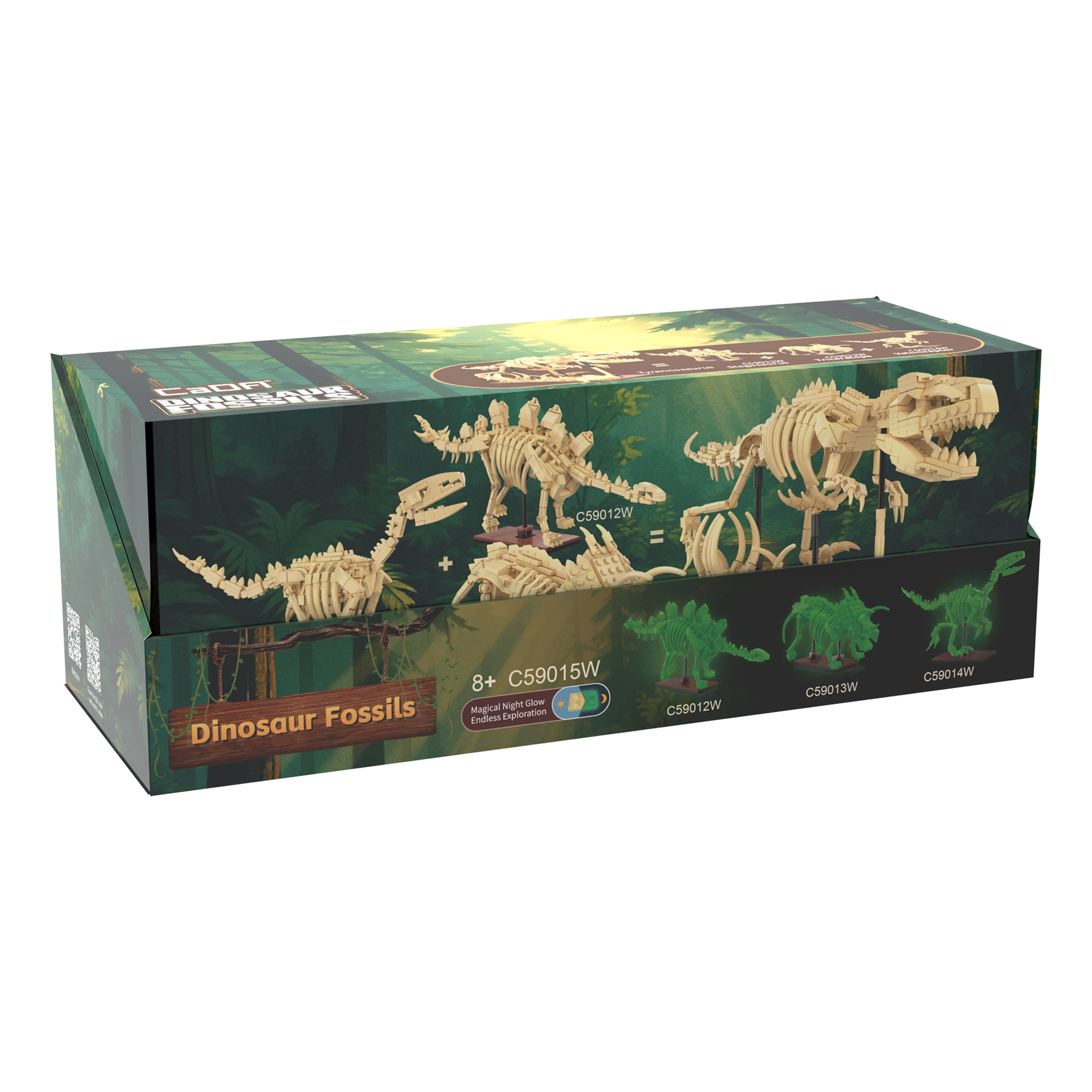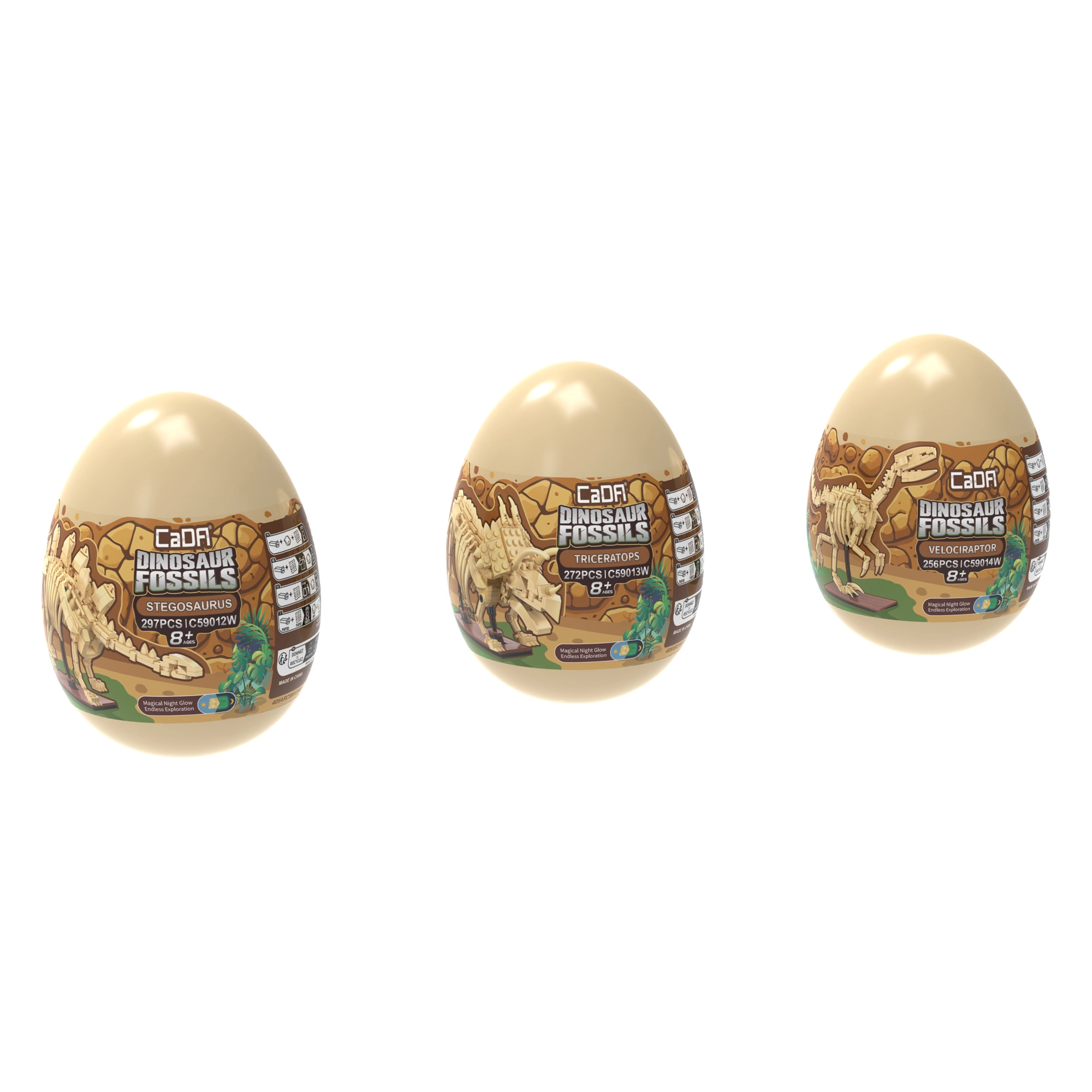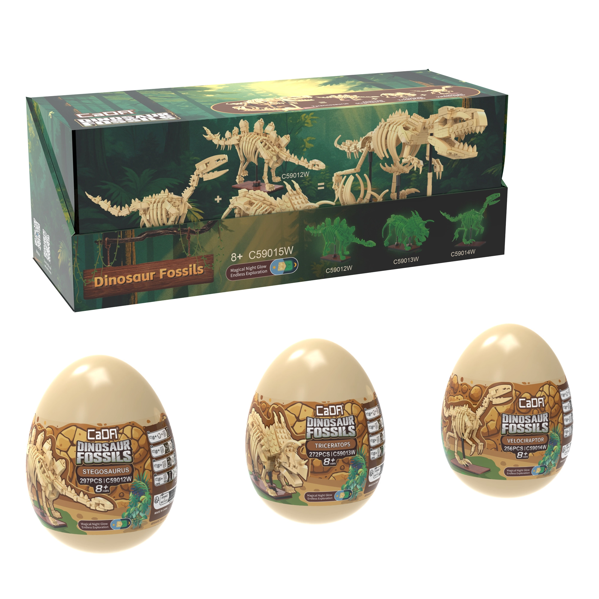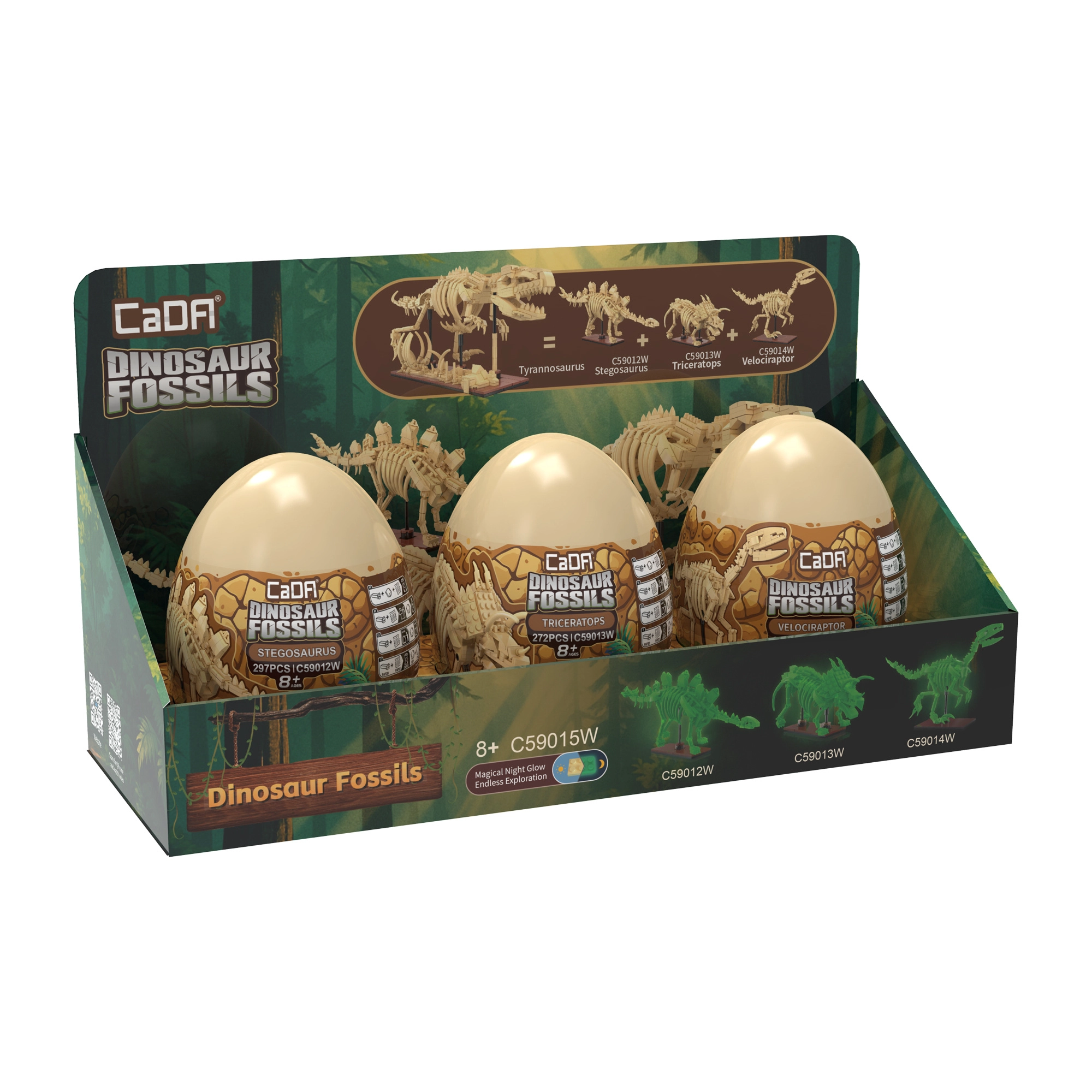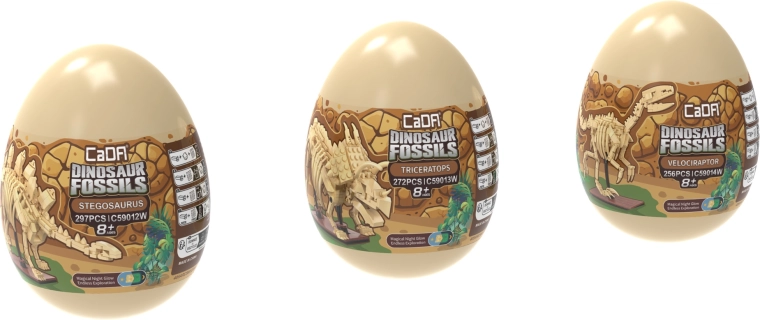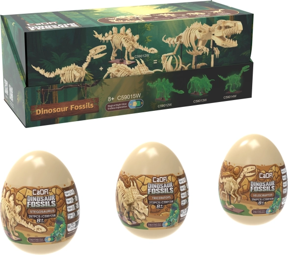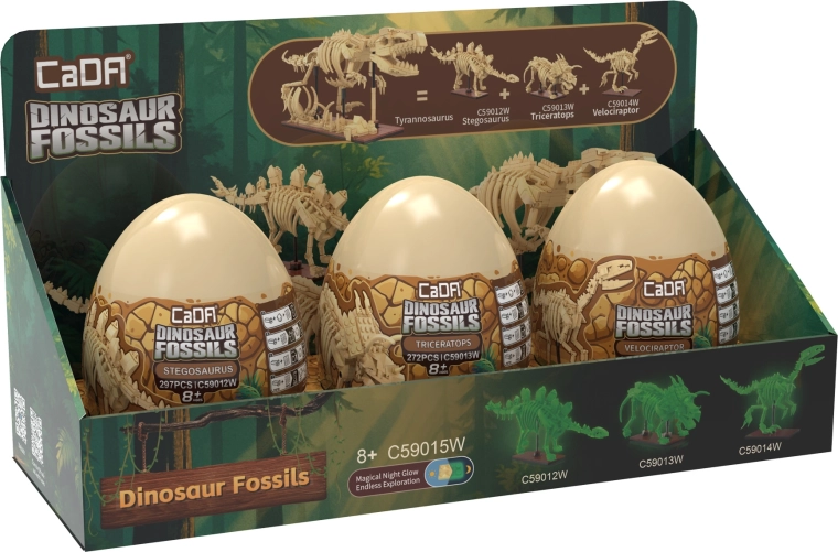 Oplev dinosaurernes fascinerende verden med byggesættet CaDA Dinosaur Fossils. Byg tre detaljerede skeletmodeller – Triceratops, Stegosaurus og Velociraptor – og kombiner dem derefter til en imponerende TYRANNOSAURUS REX. Delene har lyseffekt i mørke, leddene er bevægelige, og sættet indeholder i alt 825 kompatible dele i praktiske samler-“æg”.