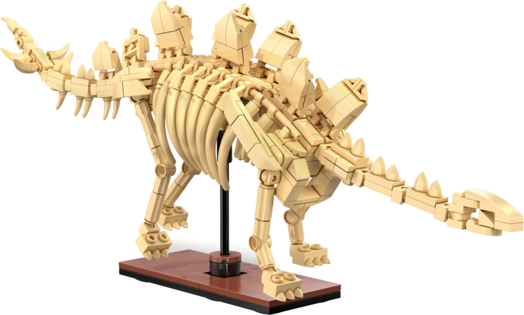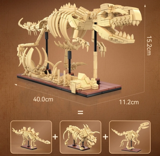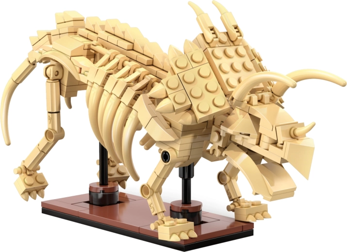 Byg detaljerede skeletter af Triceratops, Stegosaurus og Velociraptor af 825 dele og udstil dem på standere. Hver model har bevægelige led til dynamiske positurer.