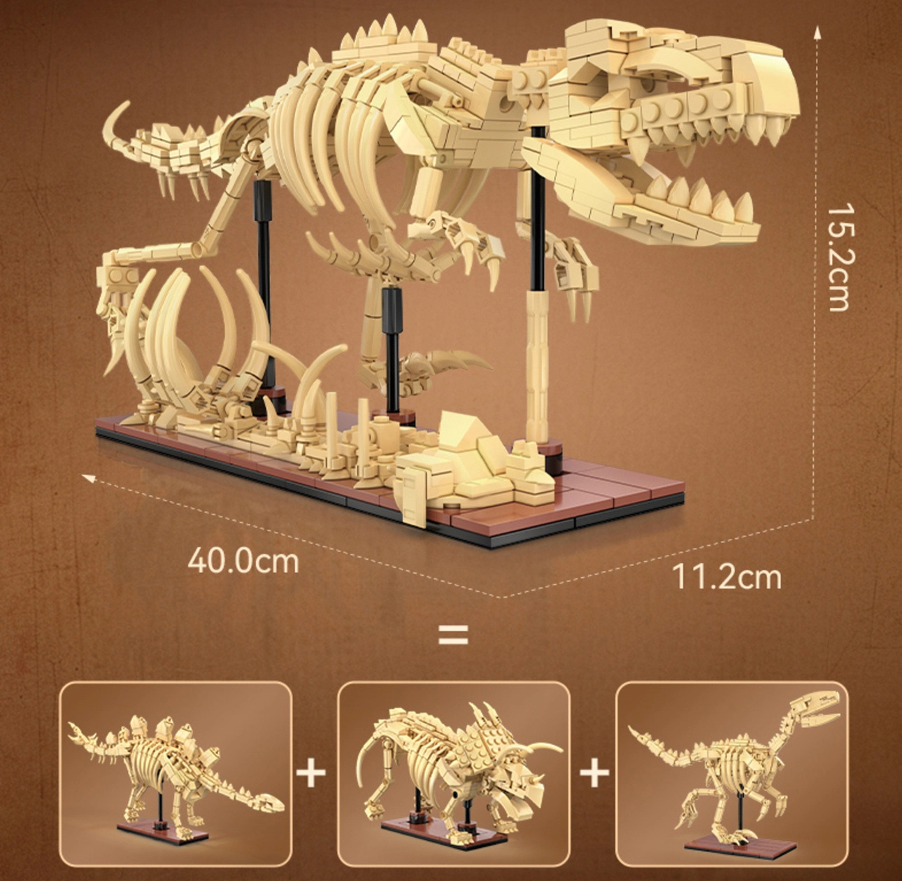 - 3 modeller i én: Triceratops (272 dele), Stegosaurus (297 dele), Velociraptor (256 dele)