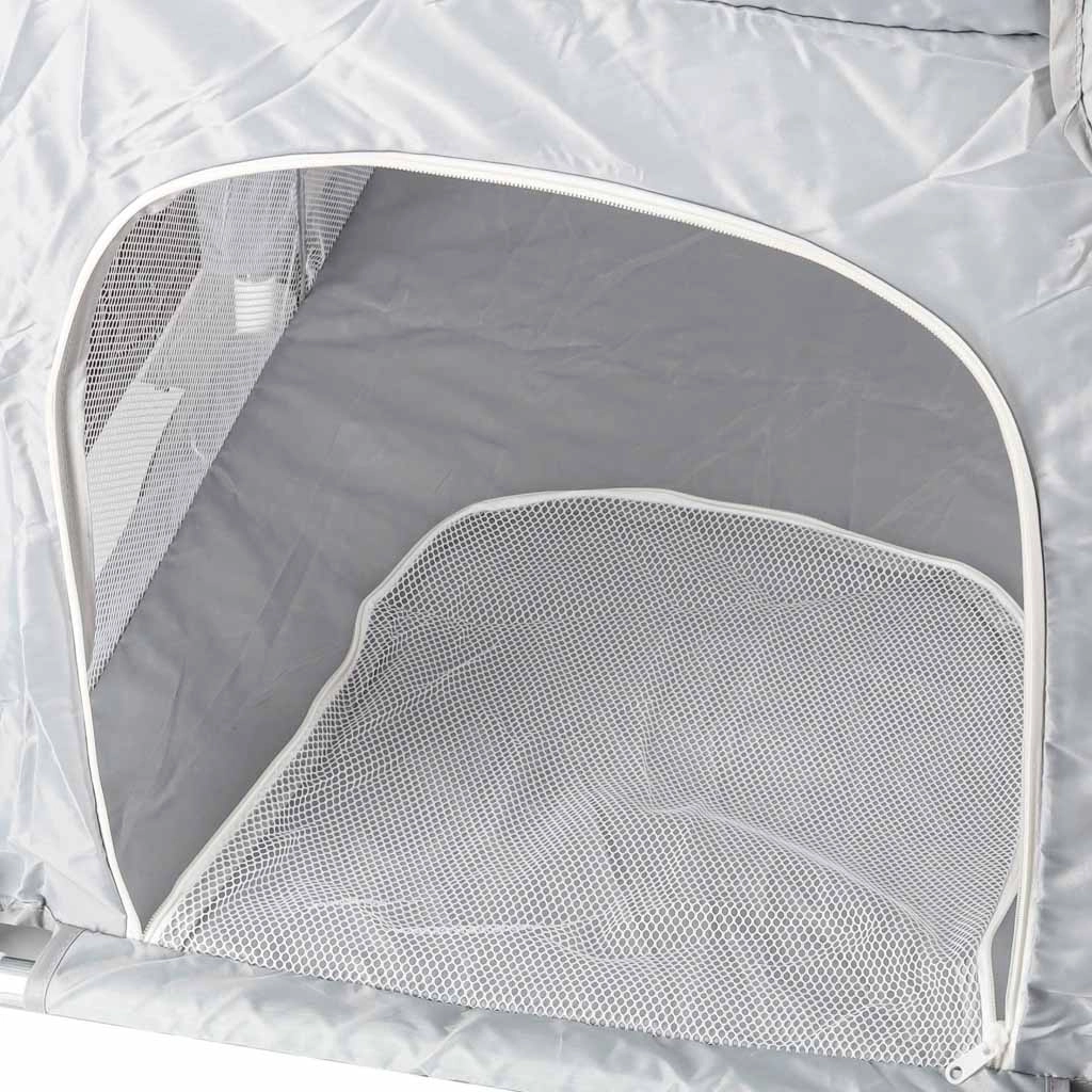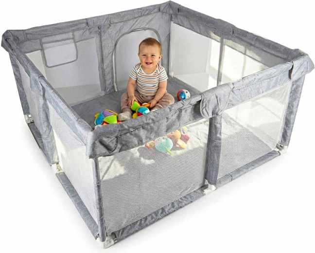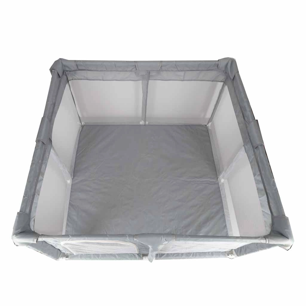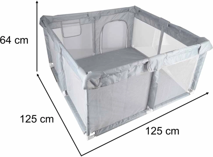 Den praktiske børnegård i målene 120 × 120 cm skaber et sikkert og rummeligt sted til leg og hvile. Takket være netvægge har du altid babyen inden for synsvidde, lynlåsdøren giver nem adgang, og let montering uden skruer sparer tid. Stabiliteten sikres af samlinger med sugekopper, og bløde tekstile kanter øger sikkerheden og komforten.